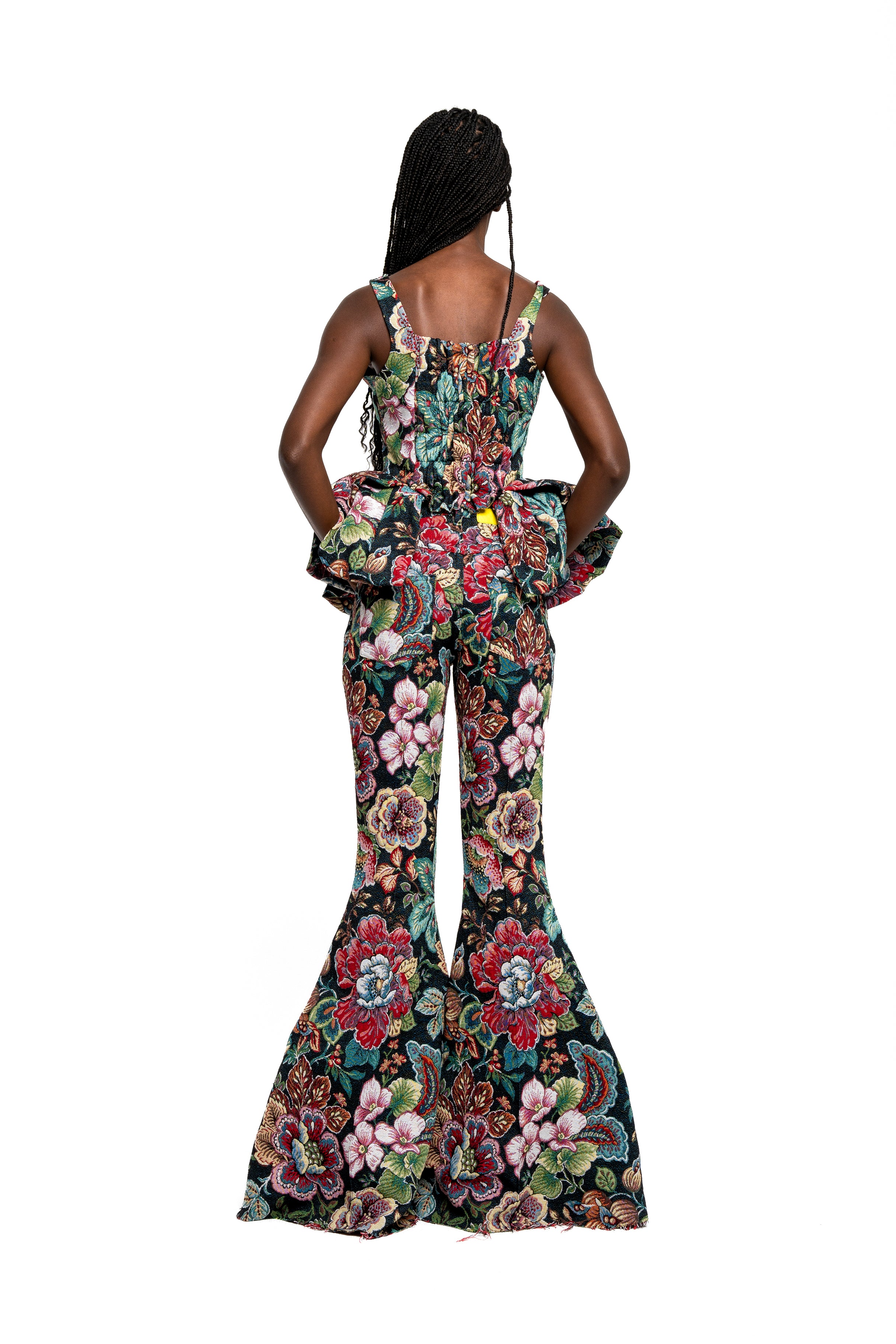 Indulge in the luxurious fusion of Black Floral Brocade Extreme Flare Trousers. Featuring a timeless 5 pocket design, a flared silhouette, and raw edges, these trousers exude an air of effortless sophistication and allure.