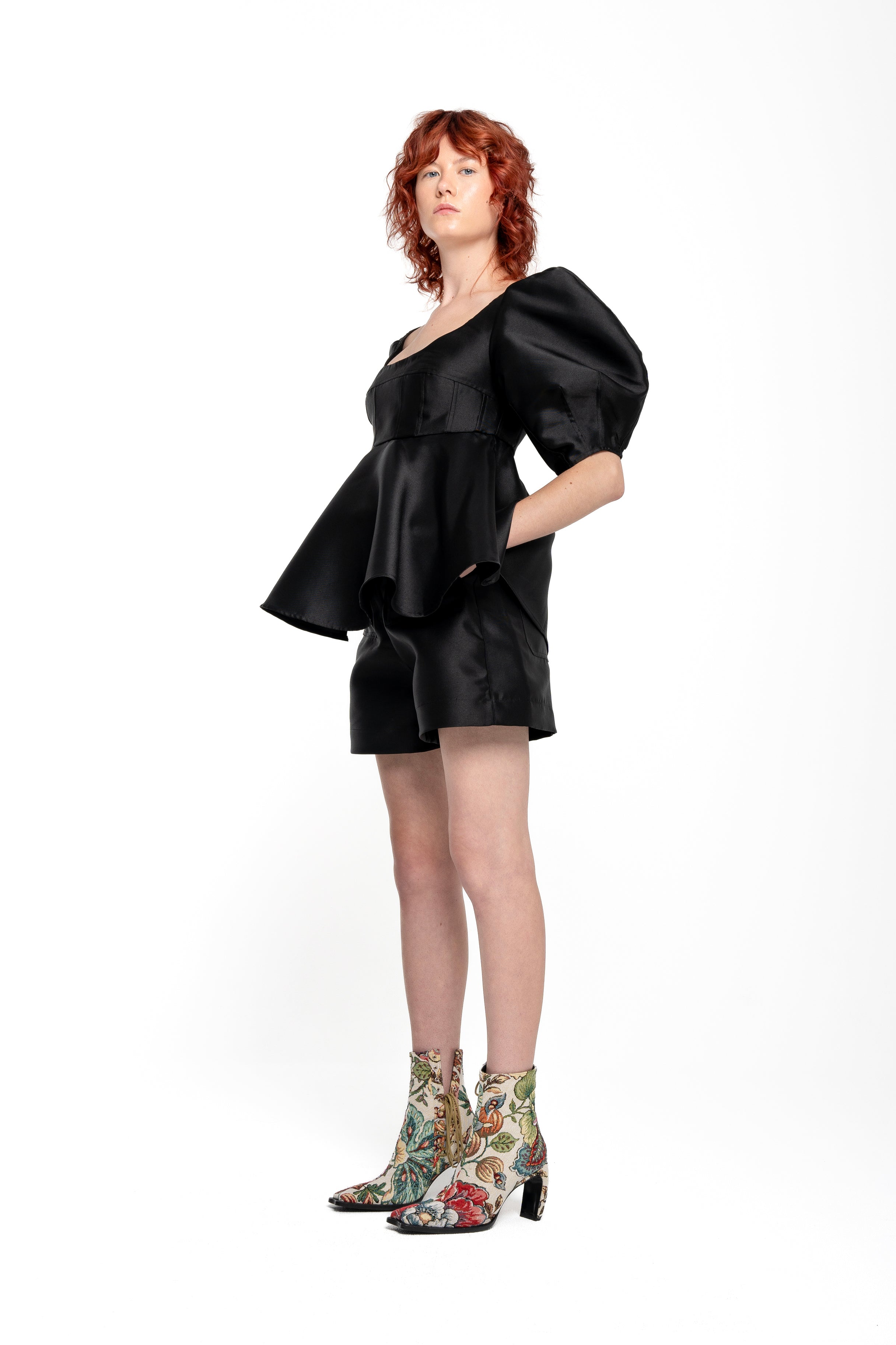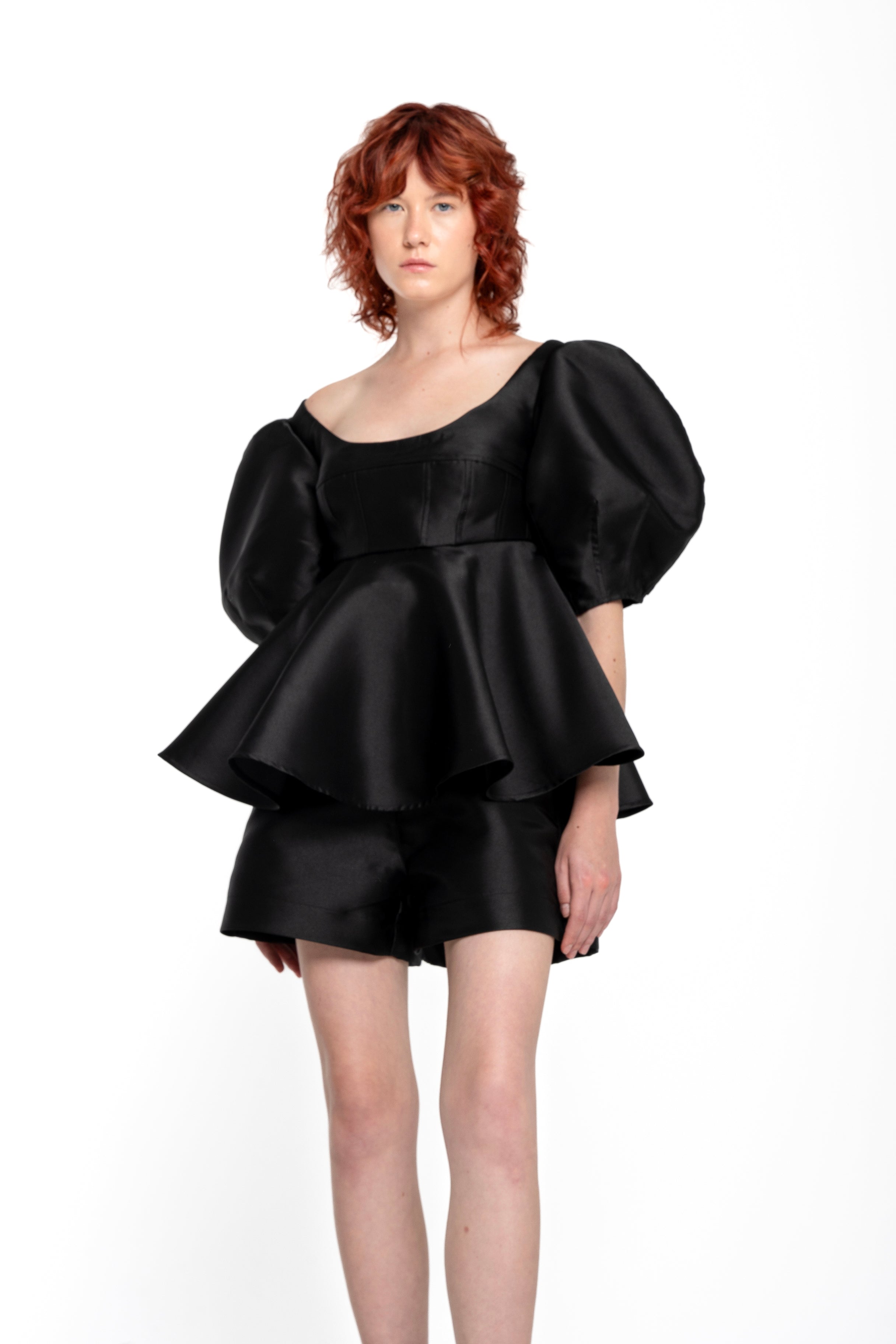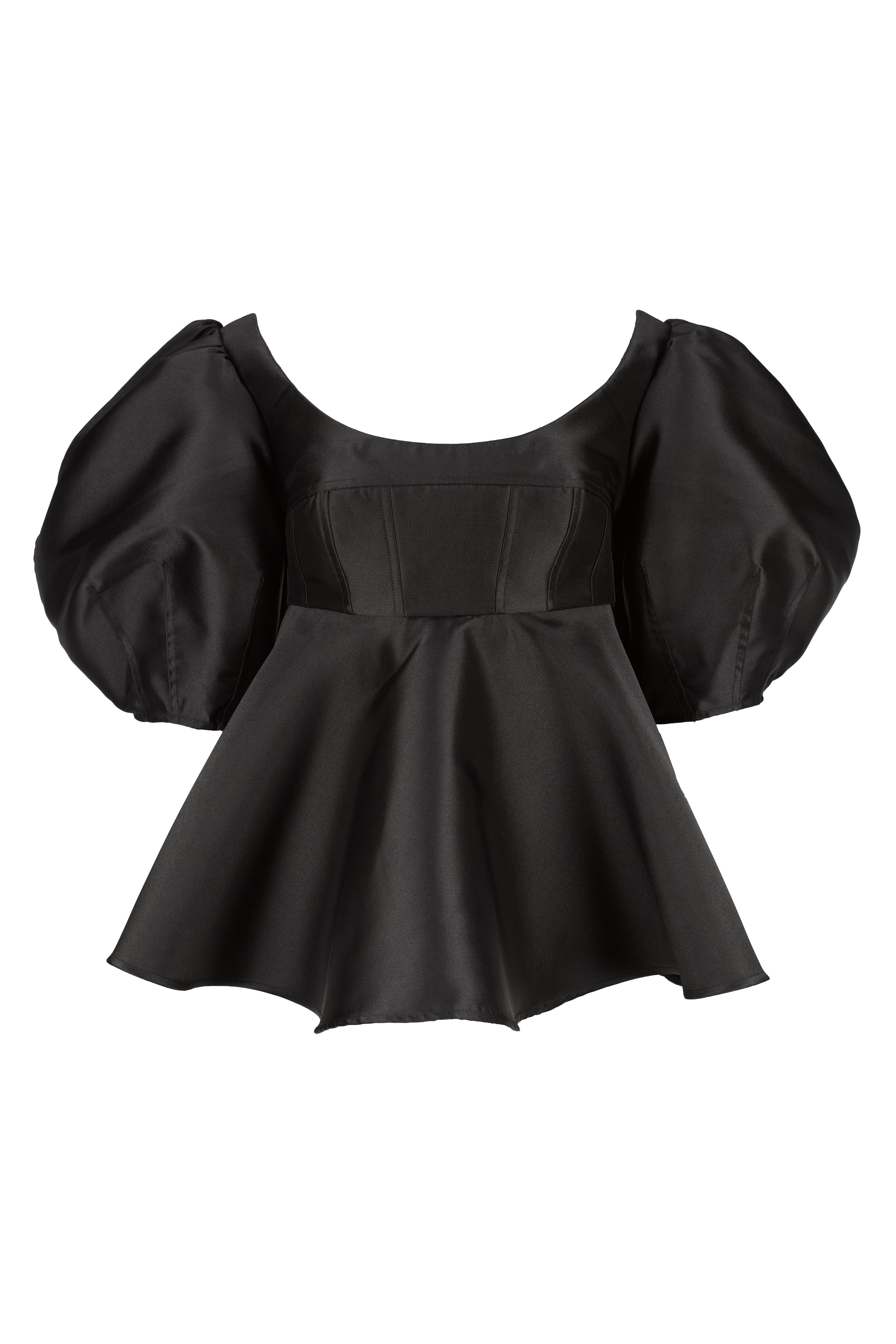 BLACK MIKADO TOP WITH PEPLUM AND BALLON SLEEVES