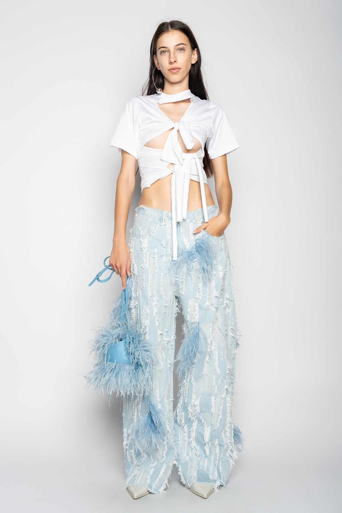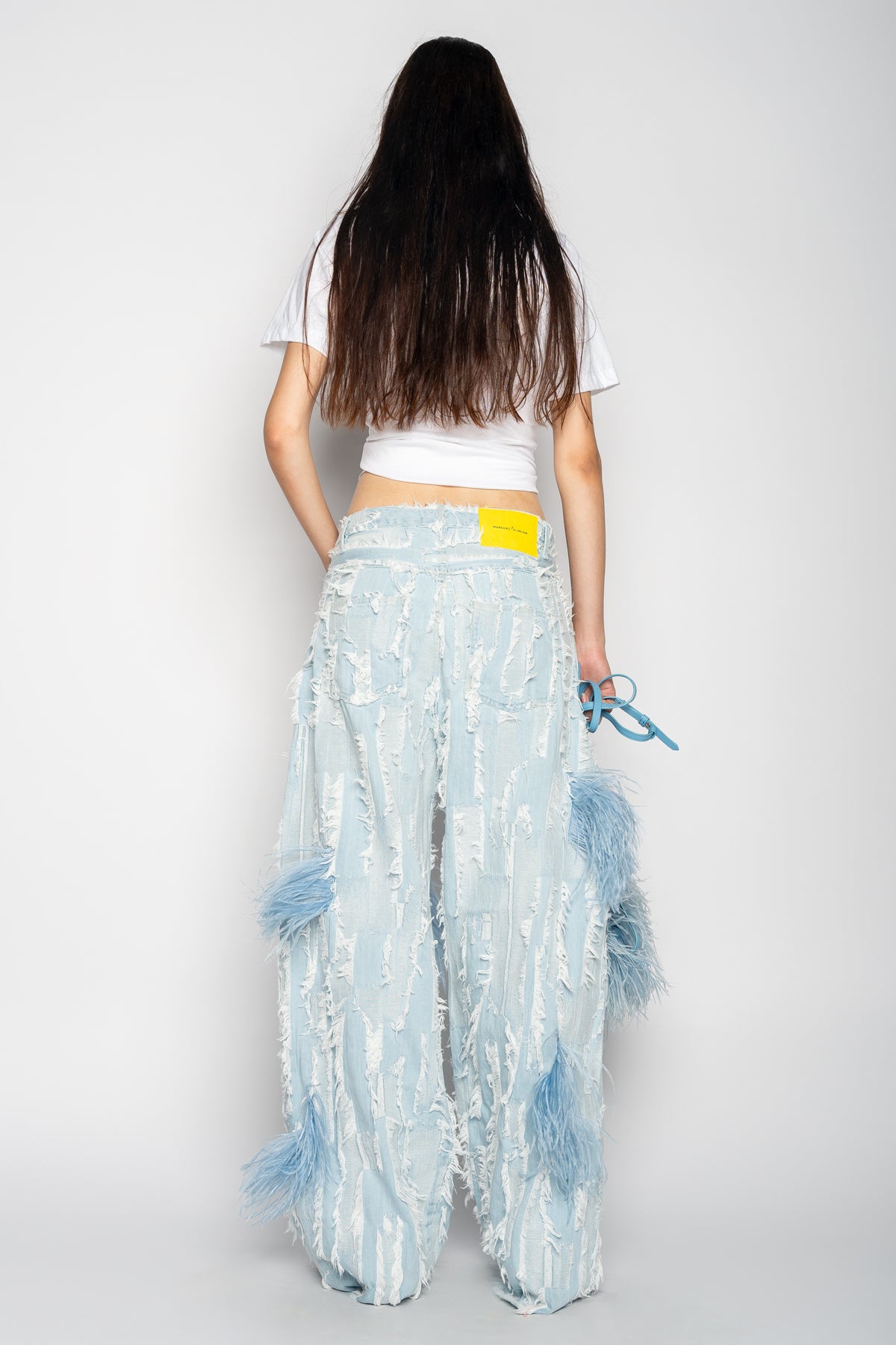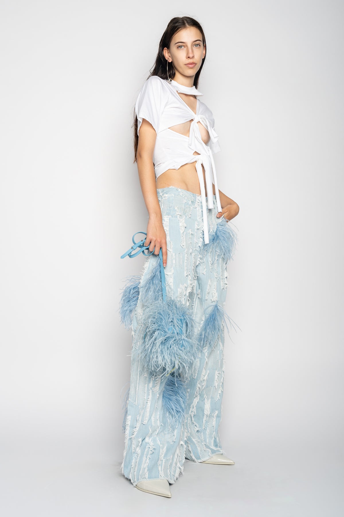 LIGHT BLUE SHREDDED DENIM BOYFRIEND TROUSERS