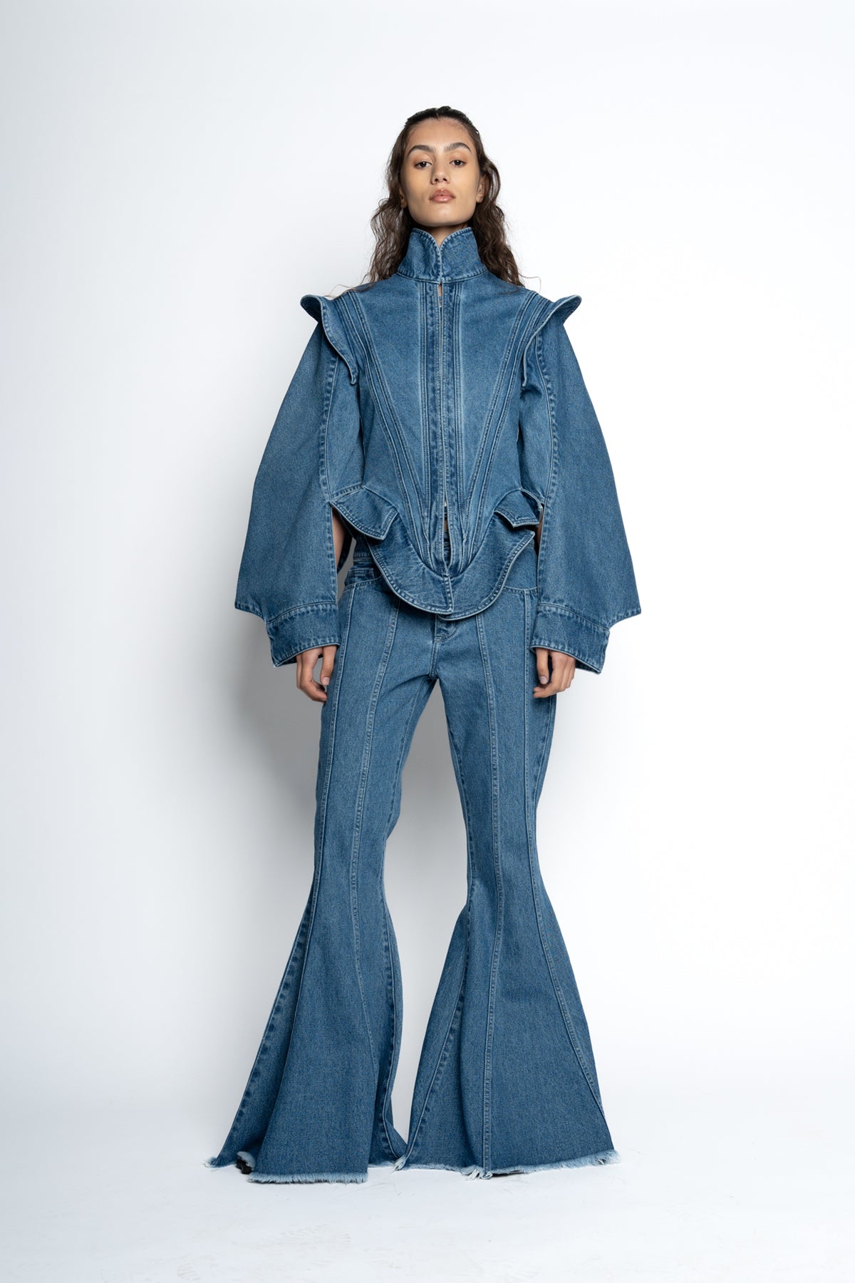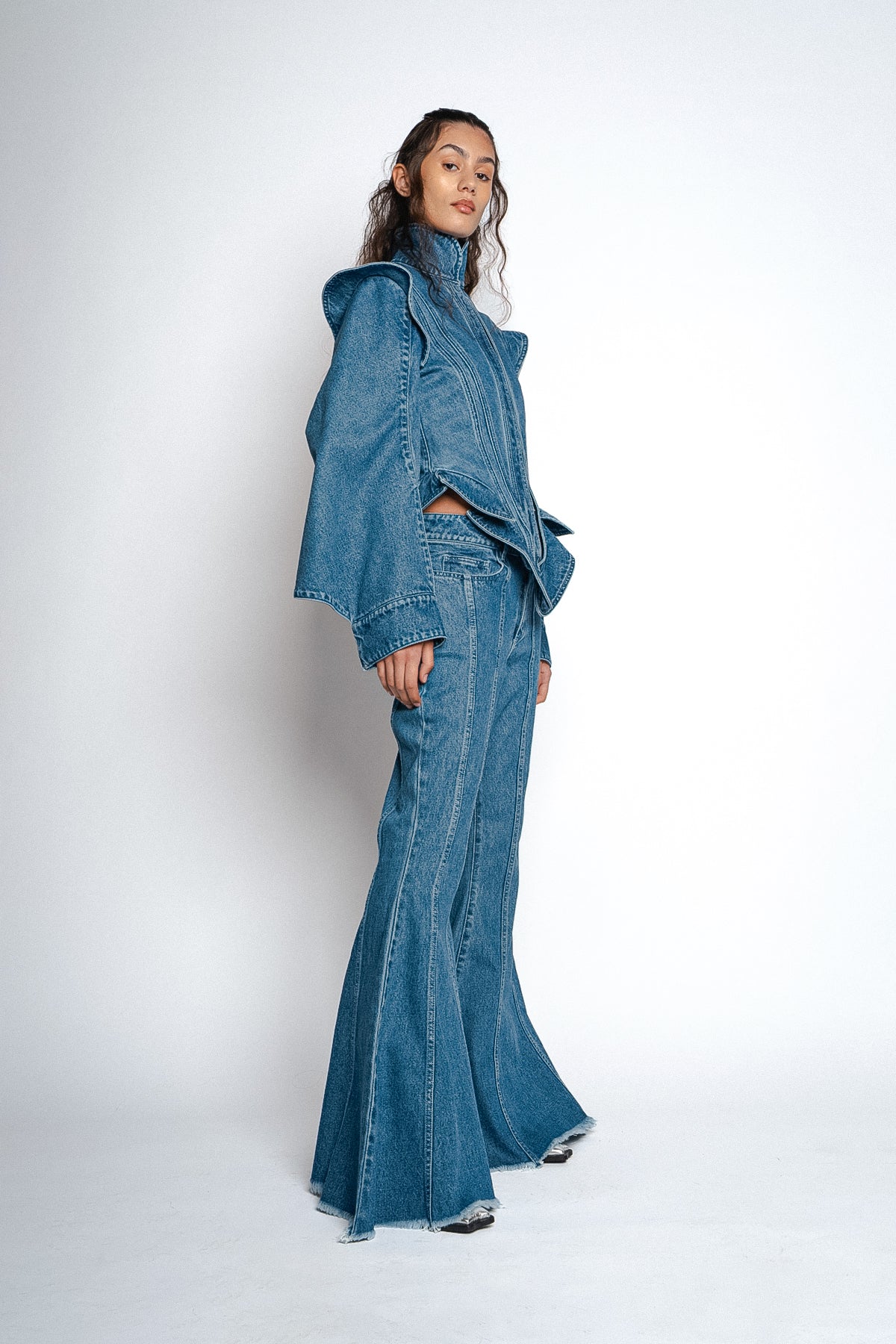 The high neckline and seamless details add a touch of elegance, while the pointy structured shoulders give off an edgy and modern vibe. Not only will you look stylish, but you'll feel confident and empowered wearing this jacket.