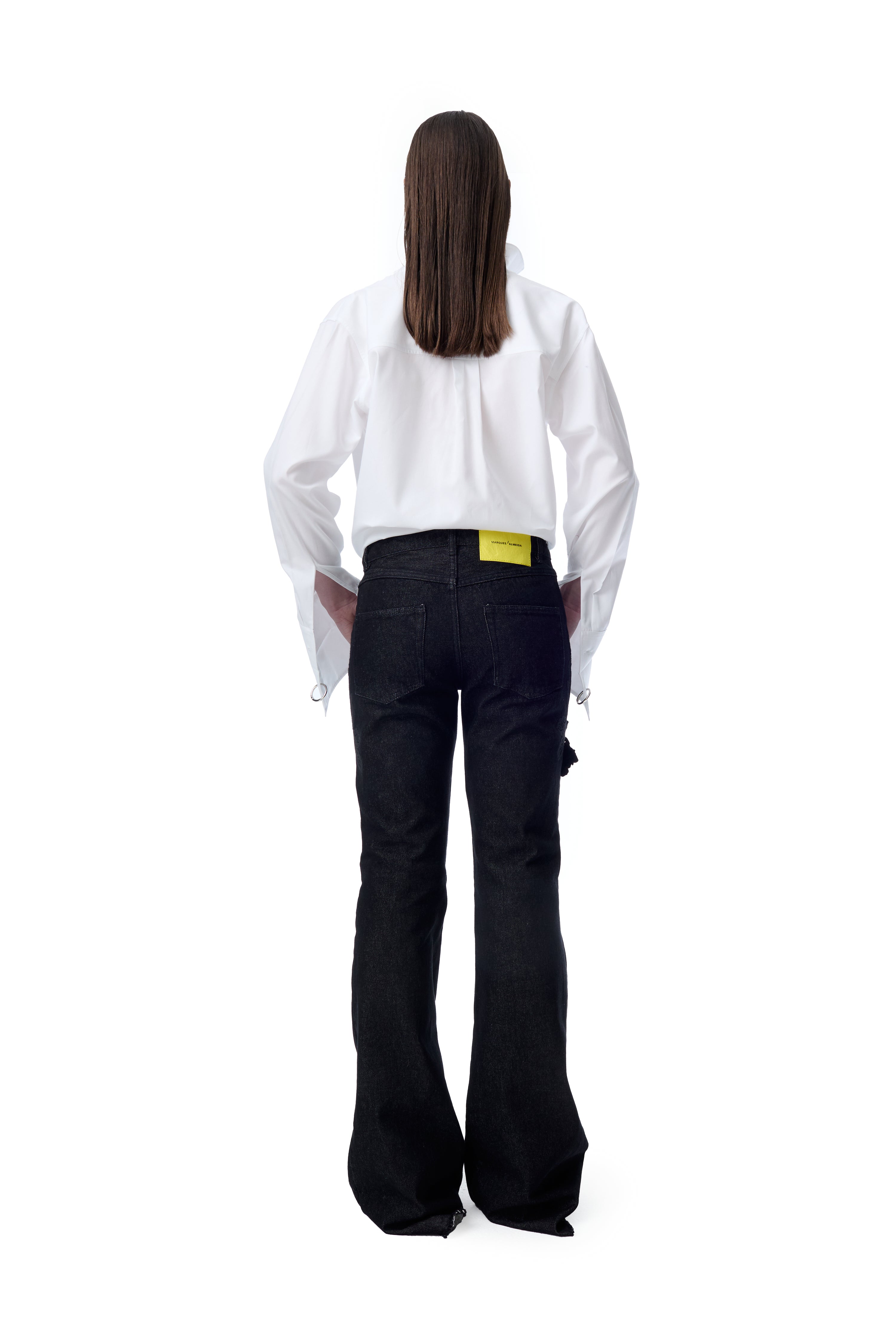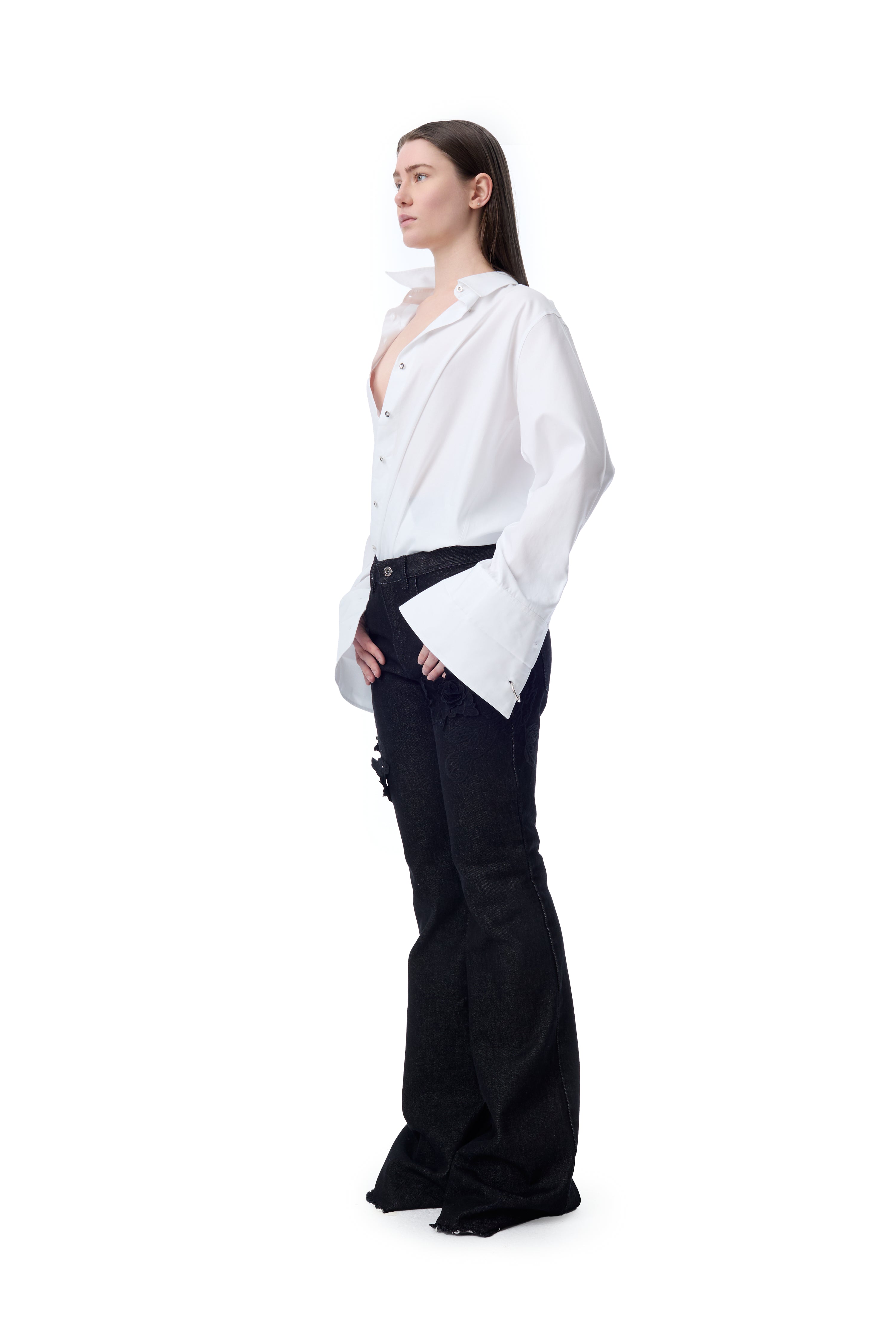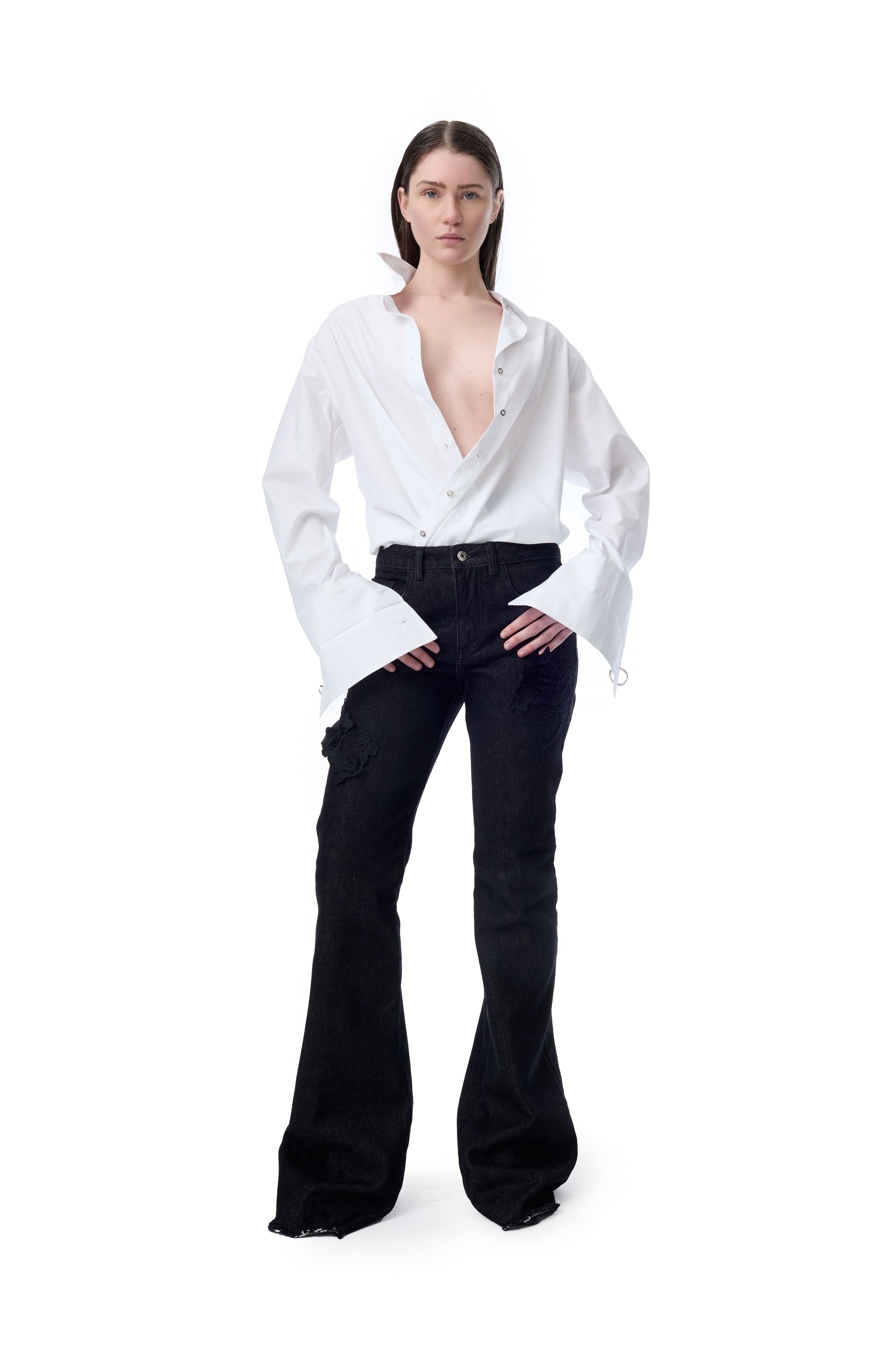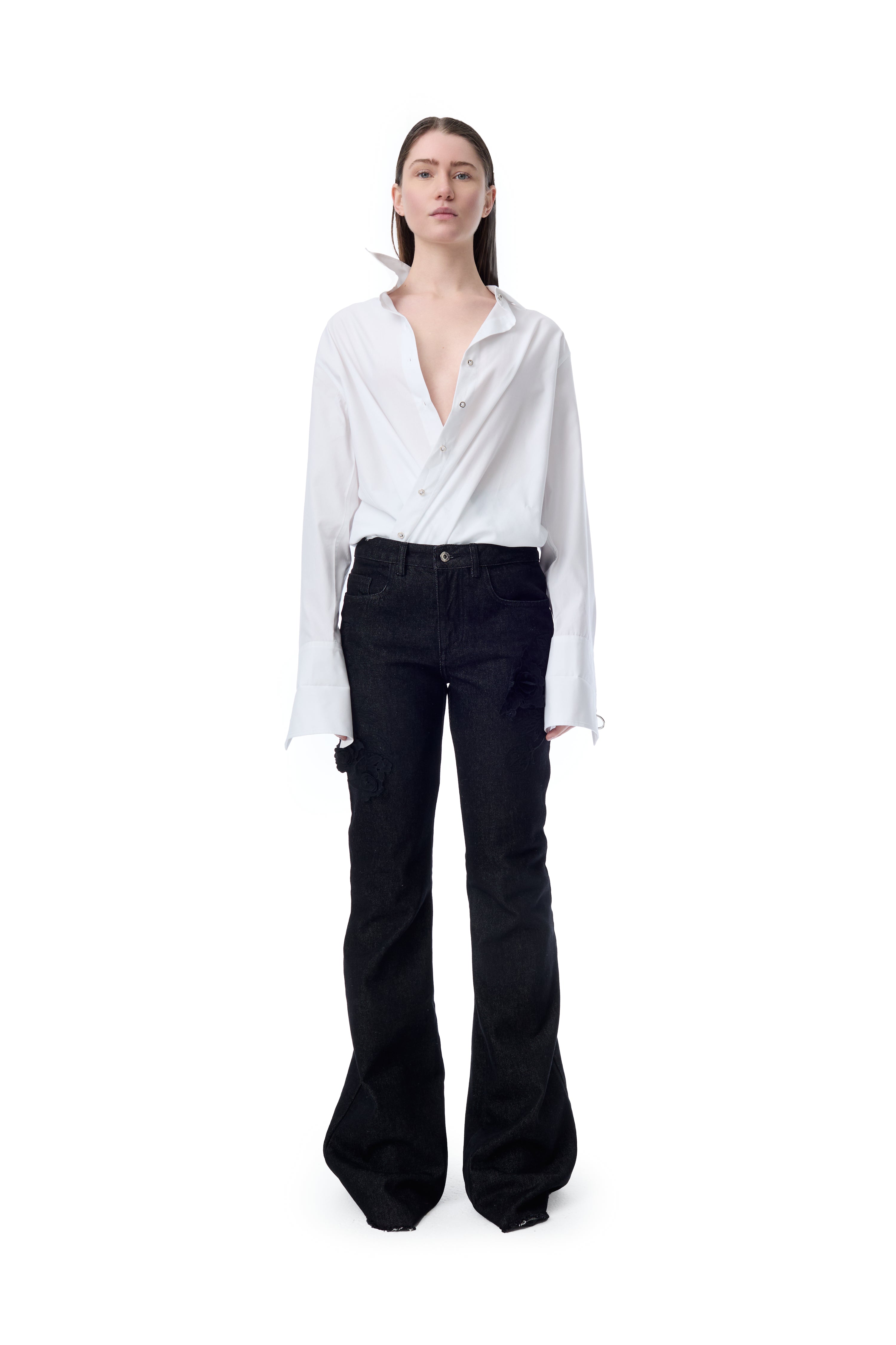 EMBROIDERED BLACK DENIM BOOTCUT JEANS