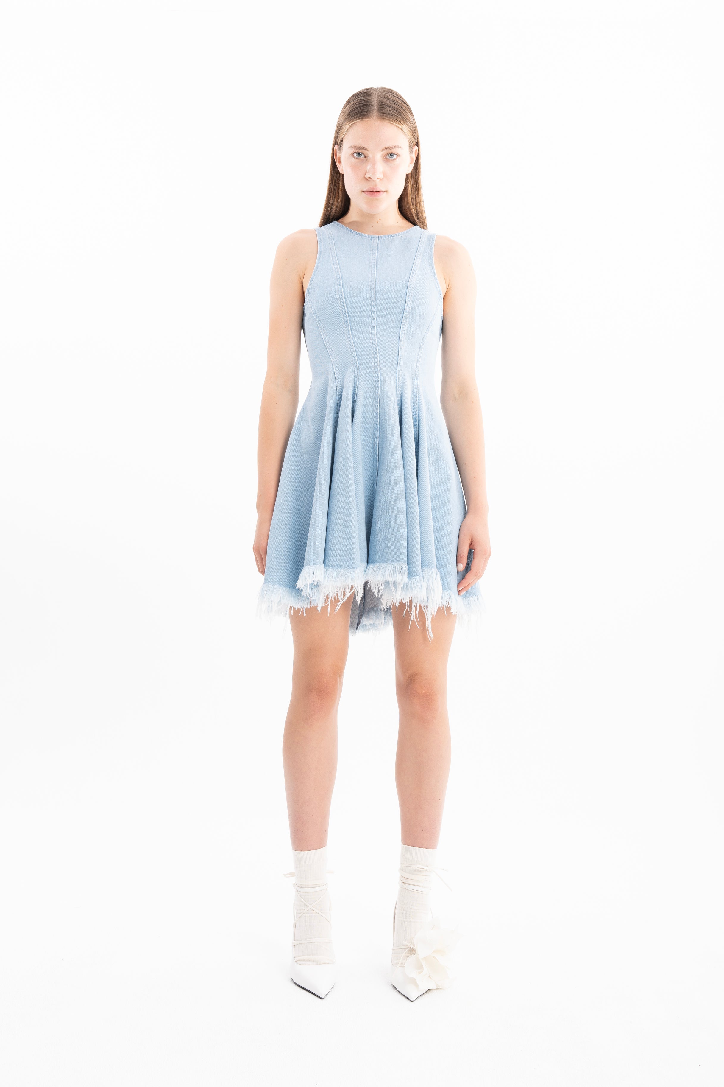 Elevate your style game with this light blue denim mini dress. Its cinched waist, sleeveless design, and unique racer shape will turn heads wherever you go. The round neckline, raw hem, and flouncy bottom provide the perfect finishing touches to this must-have piece.